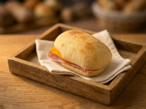 もちもち食感のフランスパン生地にハムとチーズを挟みました